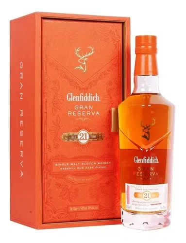 Glenfiddich Gran Reserva 21 años es un lujoso y refinado whisky escocés de pura malta, acabado en barricas de ron caribeño.Espere un perfil de sabor rico y complejo con notas de higo, plátano y caramelo, complementados con una dulzura cremosa y un toque especiado.En boca es suave y meloso, con una textura con mucho cuerpo y un final largo y cálido que muestra la influencia del ron.Es un single malt sofisticado y sabroso, perfecto para saborear en ocasiones especiales.